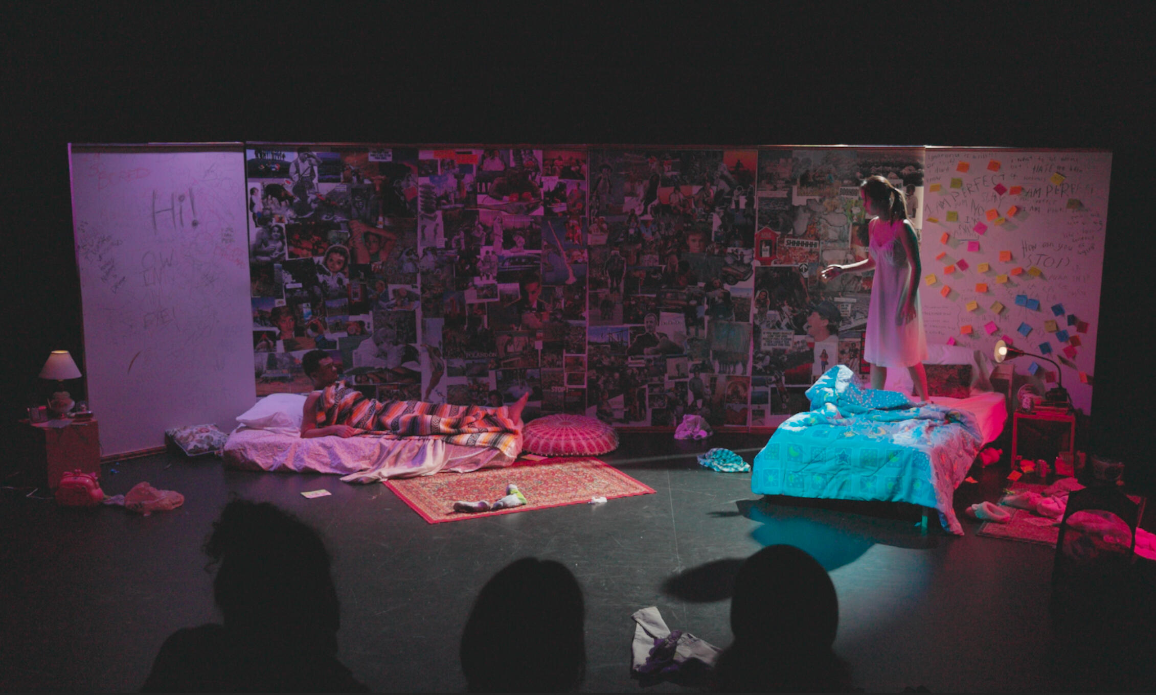 In If The World Ends Tomorrow It’s All Your Fault we explore how the media we consume comes out in us, how it not only ends up influencing how we think or feel but also alters our perception while fundamentally changing the world we live in both physically and socially. The show follows two twenty-something roommates stuck in their room (that limited but also limitless pandemic room). The script was directly taken or adapted from newspaper and magazine clippings of the past and the room itself was made of the script. Monologues guide how this media and interpersonal connection guides our perception, making the shift from a person choosing the stories they consume to now the stories choosing the person.