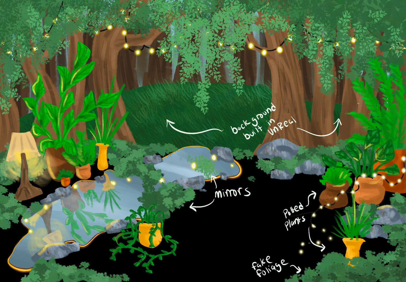 The production will be partially virtual production which means that the film will be shot almost entirely in the studio, with a background build in Unreal Engine and synced to the real life camera. We will continue to build this world through a variety of fake potted plants in the foreground and mirrors on the ground to represent water.
